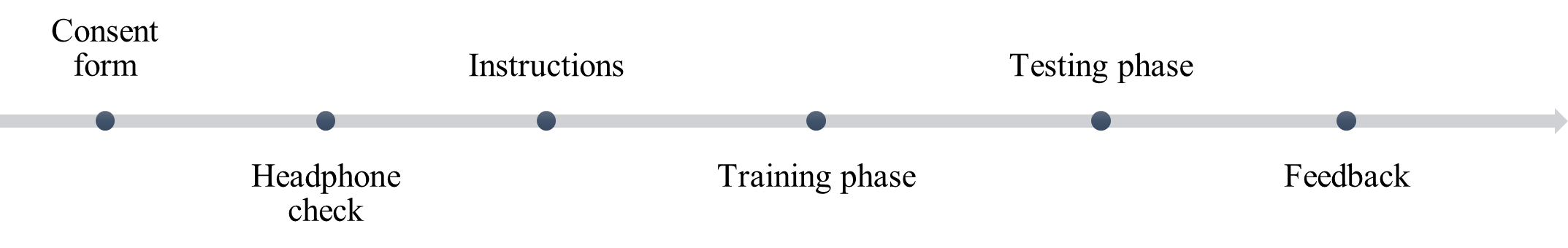 The experiment was conducted remotely (online) via a web browser. Participants had to blindly register in only one the conditions to receive a link. After the landing page, participants were required to complete a consent form and undergo a headphone check with six trials. Correct answers to four and more trials allowed them to progress to the experiment. Introductory instructions about the artificial language were provided to participants at the outset of the experiment and more specific instructions before the training and testing tasks.