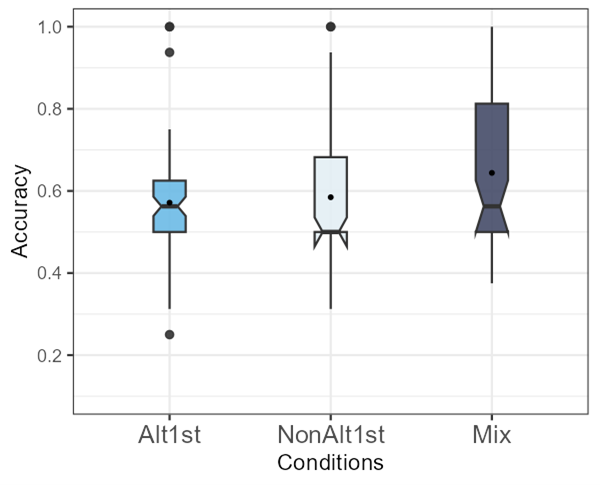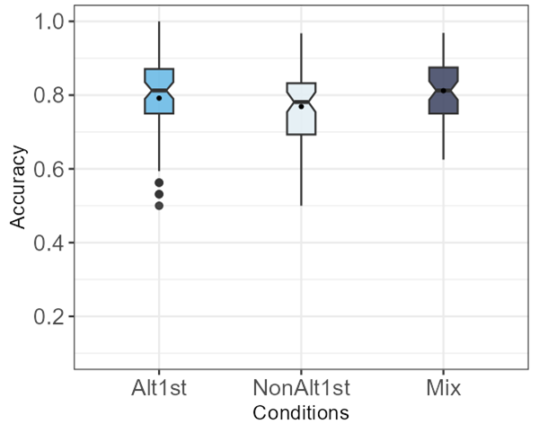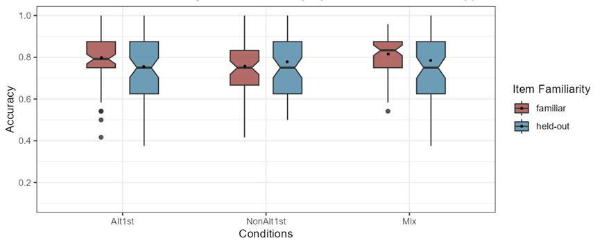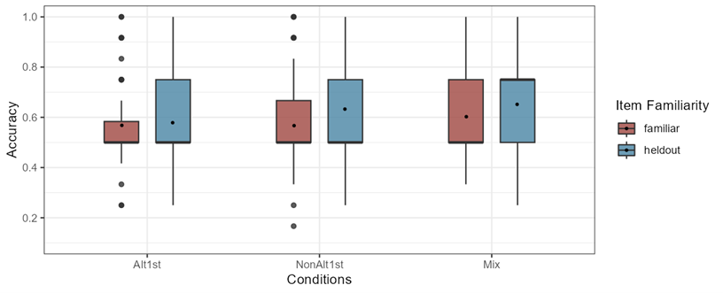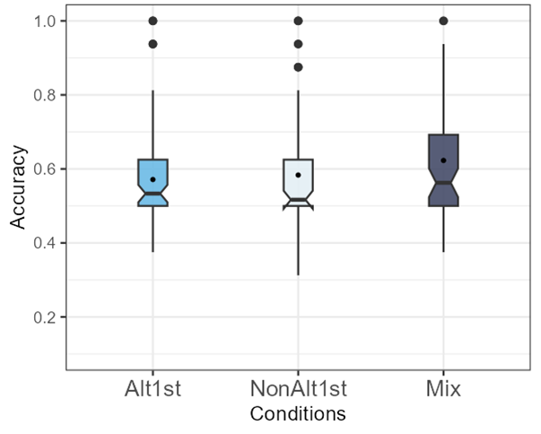 In this chapter, the results of each testing task outlined in Chapter 3 are presented individually, beginning with a review of the descriptive statistics reflecting the raw accuracy rates of responses. The descriptive statistics of the empirical results displayed in the boxplots indicate the distribution of participants’ means. Following this, the outcomes of the inferential statistical analyses are reported. The data were analyzed using mixed-effects logistic regression models implemented in R through the lme4 package version 1.1-35.3 (Bates et al. 2015) and the emmeans package version 1.10.1 (Lenth et al. 2019), in addition to being plotted with the ggeffects package version 1.5.2 (Lüdecke, 2018). In all three tasks, the dependent variable is the participants’ accuracy in the forced-choice tasks, treated as a binary variable coded as 0 (incorrect) and 1 (correct). The independent fixed variables in the analysis include training conditions in 3 levels (Alt1st=Alternating1st, NonAlt1st= Non-Alternating1st, Mix=Mixed), trial types in 4 levels (itemB-A=Basic-Alternating, itemB-NA=Basic-Non-Alternating, itemAltlt=Alternating, itemNonAltlt=Non-Alternating), and item familiarity in 2 levels (F=Familiar, H=Held-out). Additionally, all models incorporated random intercepts for both participants and items, random by-participant slopes for trial type and random by-item slopes for condition. To answer the research questions, mixed effects regression analysis was implemented to investigate statistically significant effects of the manipulated independent variables (training condition, trial type, and item familiarity or their interactions) on the accuracy of participants’ responses.