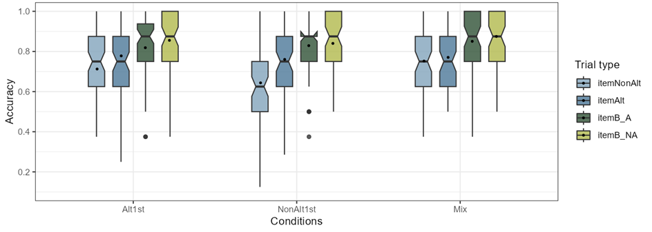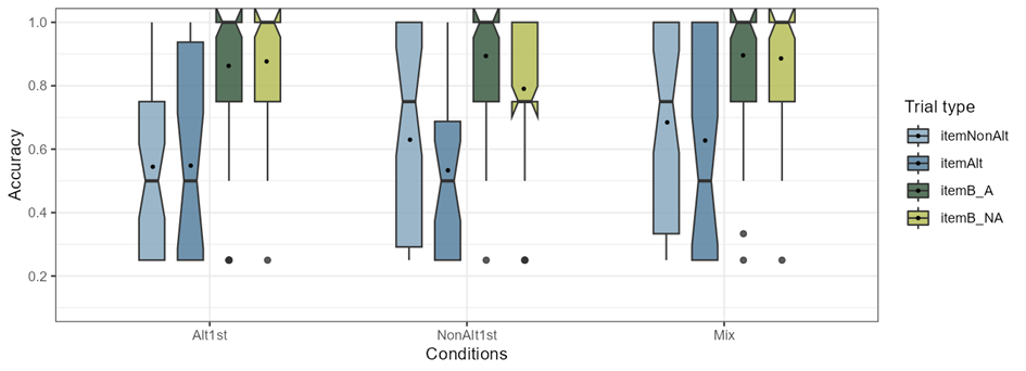The trial types were categorized in 4 levels (total n 16 = 4 levels × 4 items): itemNonAlt, itemAltlt, itemB-A, itemB-NA. Figure 4-10 shows the accuracy of conditions within different trial types, to better understand how the distribution of participant responses in the three training conditions differs across different trial types in this task and how trial types interact with conditions. As can be seen in the boxplots, for all participants, the B items (two boxes on the right) have similar distributions and their means are above 0.8 whereas within the A and NonA items (two boxes on the left) there is more variability. The corresponding means (SD) are also presented in Table 4-5 along with an example item. In the table, the highest mean value among conditions in each row (trial type) is underlined.