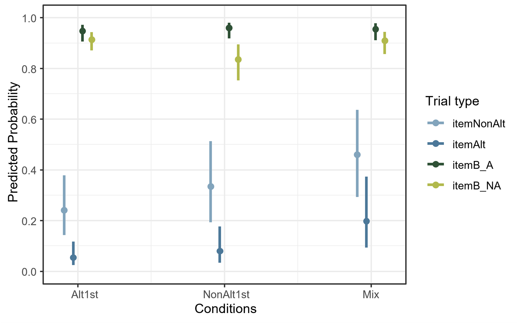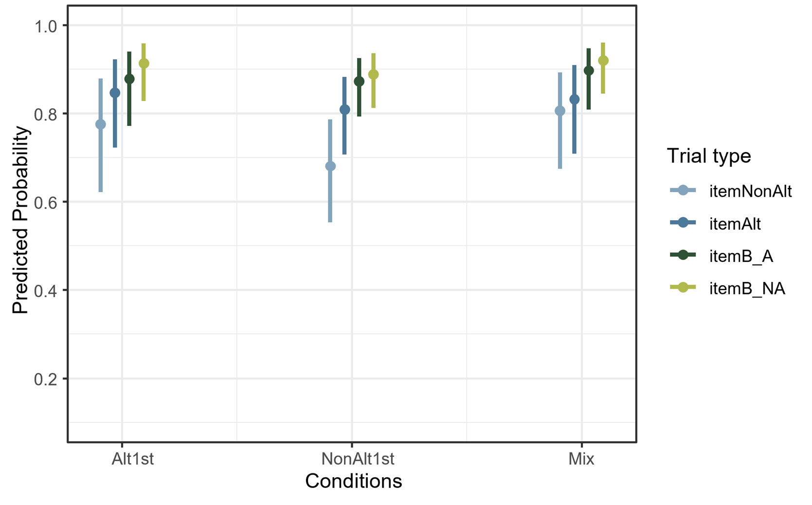 These comparisons can be viewed in Figure 4.4 which illustrates the predicted probability of accuracy from the mixed-effects logistic regression model. These probability values are averaged over the levels of item familiarity using marginal means. As can be seen from the lowest point (colored in light blue), the accuracy of participants in the NonAlt1st condition differ with other conditions on NonAlt trials more strongly with a bigger effect size.
