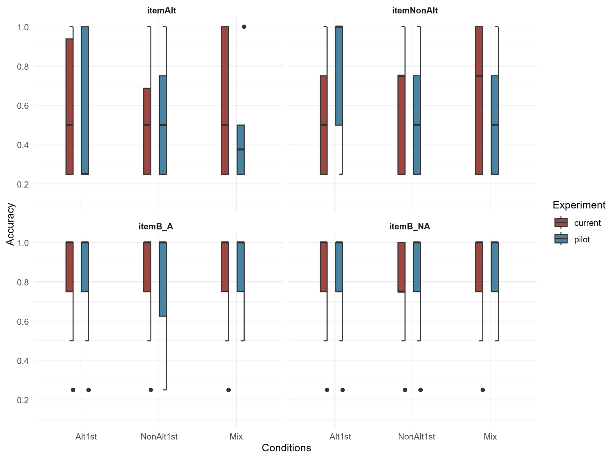 In the familiar segmentation task (Figure 5-1), the differences between the pilot and the current experiment can be summarized in two ways. All participants seem to perform well on C-initial word2s (itemB-A) in both versions. However, participants in the Mix condition seem to perform differently on V-initial word2s (itemAs) than the other conditions in the current experiment. Focusing on the right set of box and whiskers in the left facet, the median accuracy of the Mix is close to 0.5 in the current experiment in contrast to being at the floor in the pilot. In the novel segmentation task, the differences in performance between the current experiment and the pilot seem to be among V-initial word2s (itemAlt and itemNonAlt) as well.