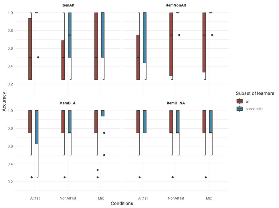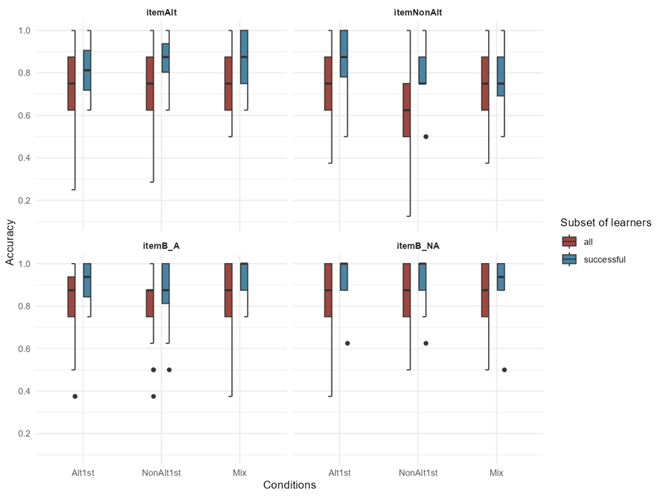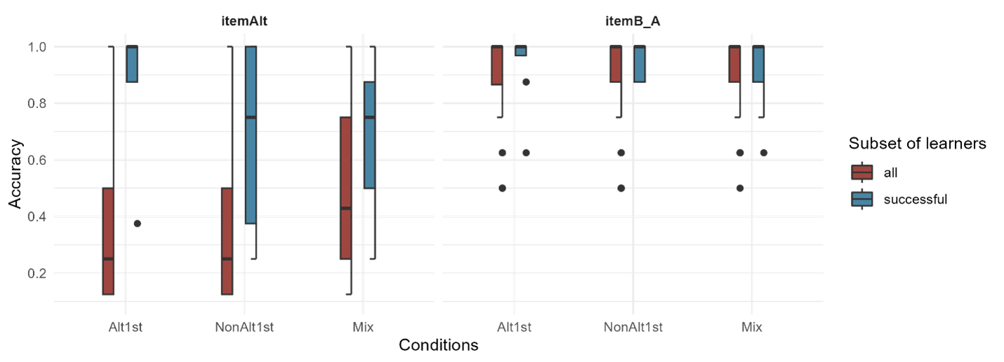 However, judging based on the descriptive statistics (such as variation and mean values) among the conditions, it appears that differences in the ability to generalize to novel items for participants in different conditions depends on the type of item. Notably, the Alt1st condition shows a ceiling effect in its ability to generalize what has been learned to novel itemAlts, while both the NonAlt1st and Mix conditions reach ceiling performance within novel itemNonAlts. These findings indicate that the trajectory of the Alt1st group differs qualitatively from the other two groups, at least within the limited sample size of successful learners.