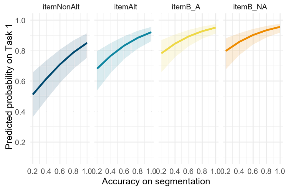 The effect seems stronger in the itemNonAlts compared to itemAlts, as the degree of the positive slope in the probability of correct responses is slightly larger. This could be an indication that the variation in responses to itemNonAlt phrases such as choosing [luʃæte] over [luæte] could have been due to the difficulties in segmentation. Similarly, among conditions, as shown in Figure 5-7 below, the variation in the responses seems to be correlated with the participant’s segmentation accuracy. This effect seems slightly stronger in Alt1st compared to the other ordered condition, NonAlt1st.