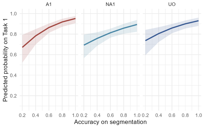 The results of the model summary show that a higher segmentation score significantly increases the probability of participant’s correct responses in the judgement task (β=2.1, SE=0.37, p=0). The likelihood ratio test comparing the model in (10) and a simpler model without the main effect of segmentation score was significant. Therefore, segmentation score is a predictor of accuracy in the judgment task.